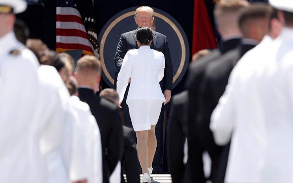 | Tổng thống Mỹ Donald Trump chúc mừng một nữ học viên tốt nghiệp Khóa 2018 tại Học viện Hải quân Mỹ. (Nguồn: Reuters) |