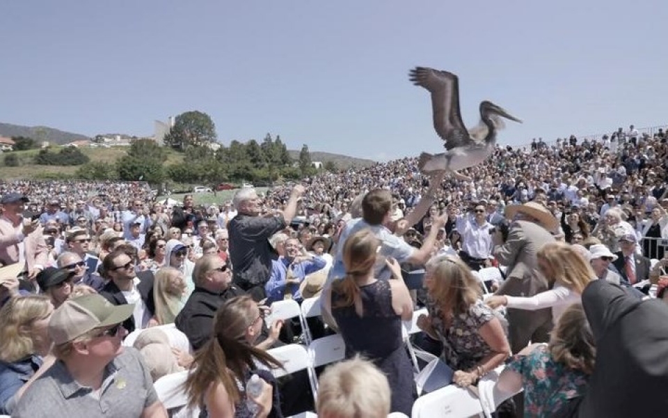 | Một chú bồ nông đã vô tình “phá đám” lễ tốt nghiệp tại trường Đại học Pepperdine, ở Malibu, California, Mỹ. (Nguồn: Reuters) |