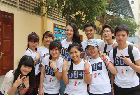 | Á hậu Thụy Vân cùng các sinh viên ĐH Công Nghiệp Hà Nội. (Ảnh: A.L) |