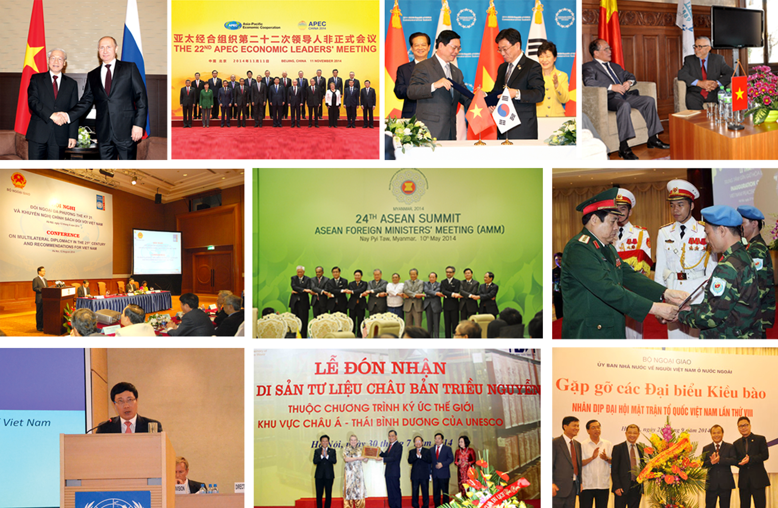 1. Tiếp tục triển khai Nghị quyết 22 của Bộ Chính trị và Chương trình hành động của Chính phủ về hội nhập quốc tế, năm 2014, Việt Nam đã thực hiện hiệu quả các hoạt động đối ngoại đa phương phục vụ thiết thực ba mục tiêu an ninh, phát triển và nâng cao vị thế trên trường quốc tế. Ban chỉ đạo quốc gia về hội nhập quốc tế do Thủ tướng Chính phủ đứng đầu được thành lập. Ngày 12/8, lần đầu tiên, Việt Nam tổ chức thành công Hội nghị "Đối ngoại đa phương thế kỷ 21 và khuyến nghị chính sách đối với Việt Nam". Quốc hội Việt Nam đã chính thức tiếp nhận đăng cai tổ chức Đại hội đồng Liên minh nghị viện thế giới (IPU) lần thứ 132 vào tháng 3/2015. Ngoài việc tham gia các diễn đàn đa phương theo thông lệ (ASEAN, APEC, ASEM), Việt Nam đã đảm nhiệm thành công vai trò Điều phối viên quan hệ ASEAN-EU, chủ động đề xuất và thúc đẩy tổ chức thành công Hội nghị cấp cao không chính thức ASEAN-EU; lần đầu tiên tham gia các hội nghị bộ trưởng quốc phòng mở rộng Mỹ -ASEAN, Nhật Bản - ASEAN…
