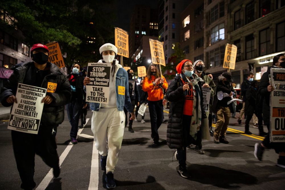| Mặc dù vào ngày bầu cử, các vụ đe dọa hoặc bạo lực lớn hầu như không xảy ra tại các điểm bỏ phiếu, nhưng cảnh sát vẫn luôn hiện diện khắp thành phố New York khi các cuộc biểu tình và tuần hành ôn hòa bắt đầu vào đêm 3/11. Những người biểu tình ôn hoà cầm bảng hiệu tuần hành gần quảng trường Union ở Manhattan vào đêm bầu cử. (Nguồn: FTWP) |
