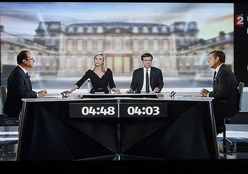 | Hai ứng cử viên Sarkozy (bên phải) và Hollande (bên trái) trong buổi tranh luận trực tiếp trên truyềng hình Pháp |