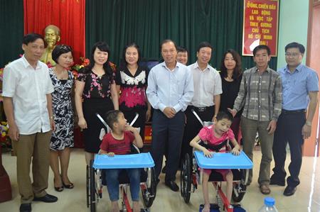 | Trợ lý Bộ trưởng Ngoại giao Nguyễn Quốc Dũng và lãnh đạo Sở lao động - Thương binh và Xã hội tỉnh Tuyên Quang trao xe lăn cho 2 trẻ em khuyết tật có hoàn cảnh khó khăn huyện Yên Sơn. |