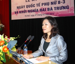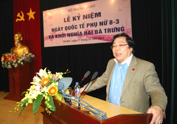 | Thứ trưởng Ngoại giao Nguyễn Thanh Sơn phát biểu tại Lễ mít tinh kỷ niệm ngày Quốc tế phụ nữ 8/3. |