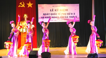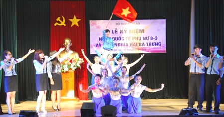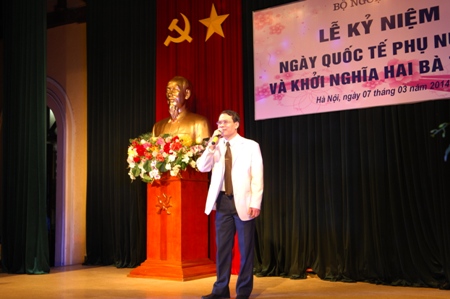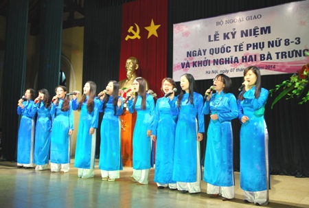 Ngay sau phần ủng hộ quỹ từ thiện năm 2014 do Ban Nữ công của Bộ phát động là phần văn nghệ chào mừng với những tiết mục đặc sắc do cán bộ, nhân viên trong Bộ và sinh viên Học viện Ngoại giao trình diễn. Buổi lễ đã diễn ra trong không khí vui tươi, thân tình, tràn ngập tiếng cười và những đóa hoa dành cho chị em phụ nữ nhân ngày mùng 8 tháng 3.