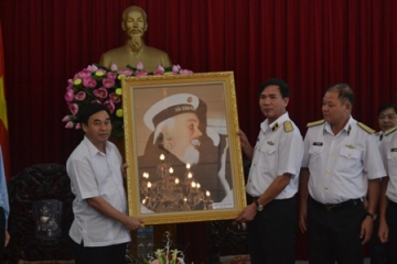 | Lãnh đạo Bộ Tư lệnh Hải quân trao quà lưu niệm cho Thứ trưởng Ngoại giao Hồ Xuân Sơn và đoàn công tác Bộ Ngoại giao. Ảnh: Minh Châu/TGVN |