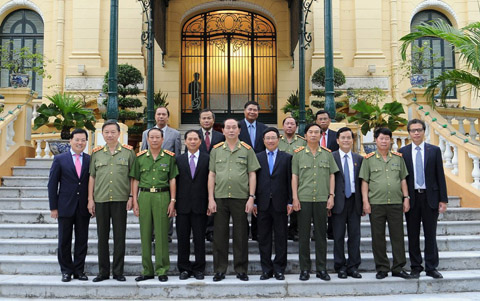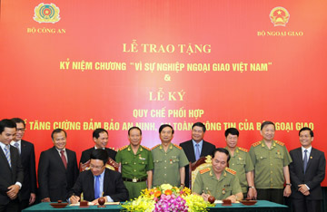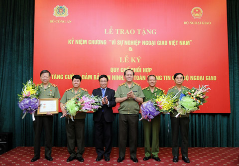 | Thay mặt Bộ Ngoại giao, Phó Thủ tướng, Bộ trưởng Ngoại giao Phạm Bình Minh trao tặng Kỷ niệm chương Vì sự nghiệp Ngoại giao cho Bộ trưởng Bộ Công an Trần Đại Quang và các lãnh đạo Bộ Công an. |