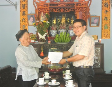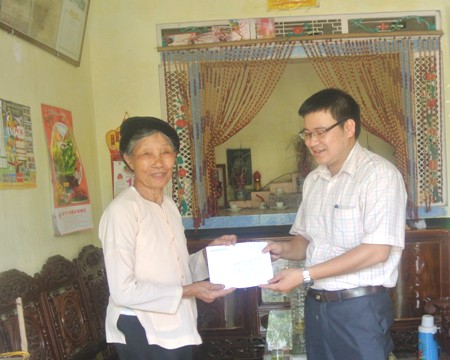 | Đại diện Công đoàn Bộ Ngoại giao trao quà cho mẹ Lê Thị Mít tại xã Vũ Tiến, Vũ Thư, tỉnh Thái Bình có con trai duy nhất là Liệt sỹ. |