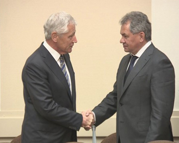 | Bộ trưởng Quốc phòng Nga Sergei Shoigu và Bộ trưởng Quốc phòng Mỹ Chuck Hagel. |