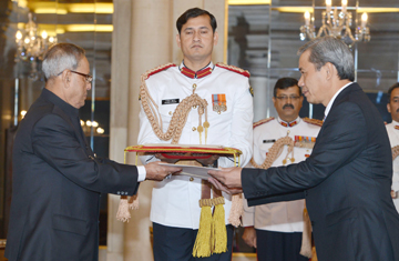 | Đại sứ Việt Nam tại Ấn Độ Tôn Sinh Thành (phải) trình Quốc thư lên Tổng thống Ấn Độ. |