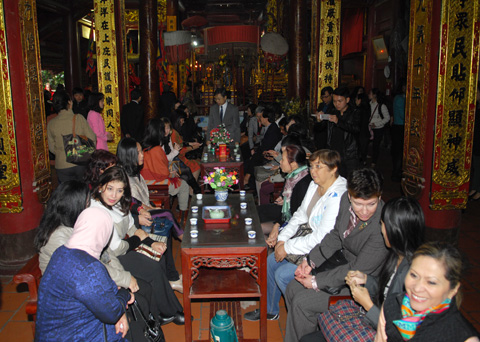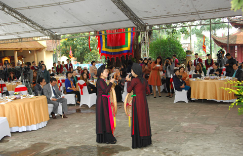 Trong không khí thân mật, các vị khách mời say sưa trong những bài quan họ đặc sắc như Mời trầu, Giã bạn…được các liền anh, liền chị quê hương Bắc Ninh biểu diễn; thưởng thức những món ăn truyền thống mang đậm hương vị miền Kinh Bắc bên ly trà, ly cà phê và trực tiếp xem quy trình sản xuất tranh Đông Hồ.