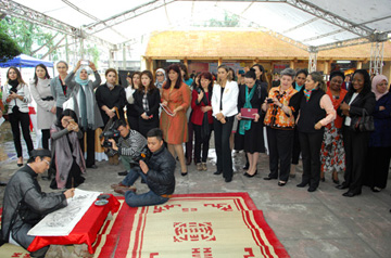 | Các vị khách mời trực tiếp xem quy trình sản xuất tranh Đông Hồ. |