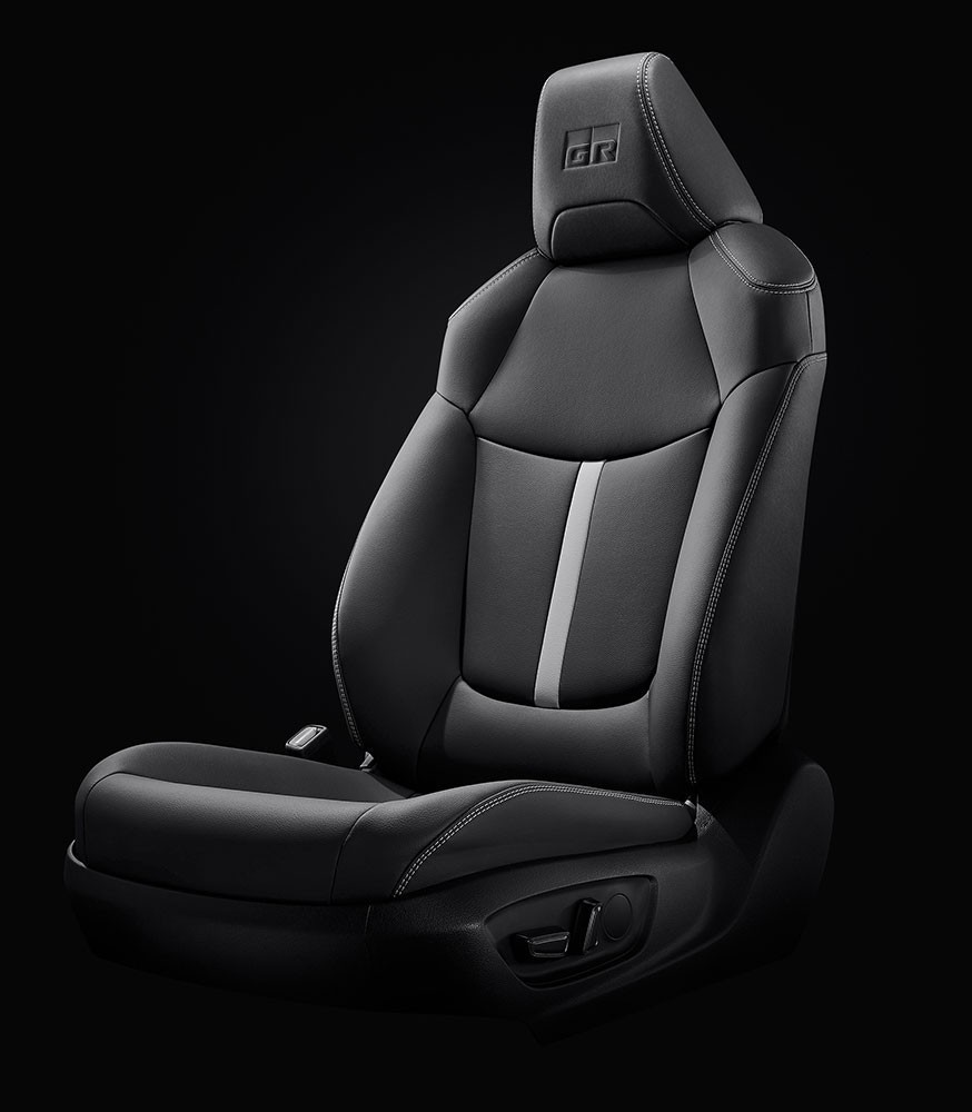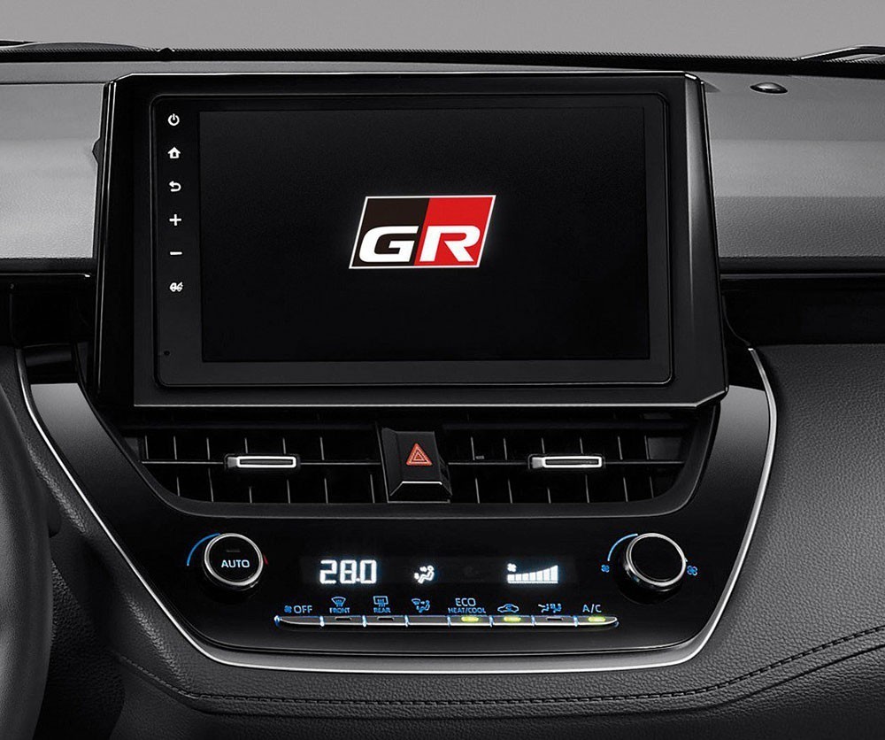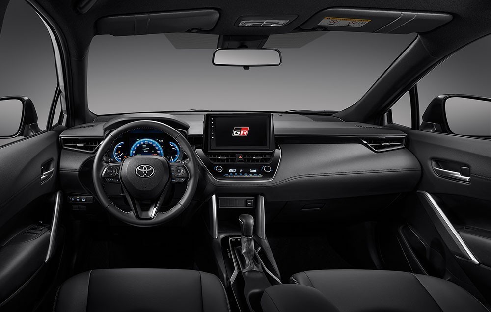 Bên trong Toyota Corolla Cross GR Sport 2021 là không gian nội thất bọc da màu đen với ghế được khâu bằng chỉ màu trắng mới. Logo "GR" xuất hiện khắp nơi như ở màn hình trung tâm khi khởi động, nút bấm đề nổ và tựa đầu ghế. Tương tự bản thường, xe cũng được trang bị màn hình thông tin giải trí dạng cảm ứng 9 inch.
