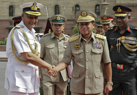 | Đại tướng Min Aung Hlaing (phải) bắt tay Tư lệnh Hải quân Ấn Độ Admiral Verma (Nguồn: The Hindu) |