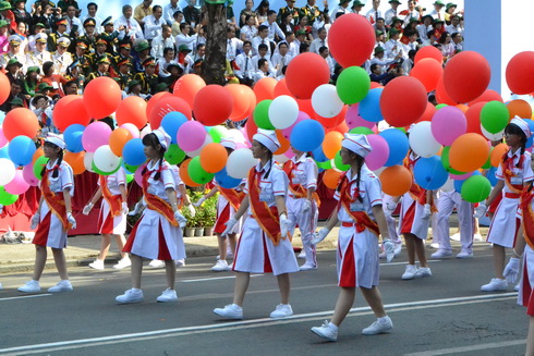 Các em học sinh, đại diện cho thế hệ trẻ - chủ nhân tương lai của đất nước đem đến những mảng màu sắc vui tươi cho buổi Lễ mít tinh, diễu binh, diễu hành. |
