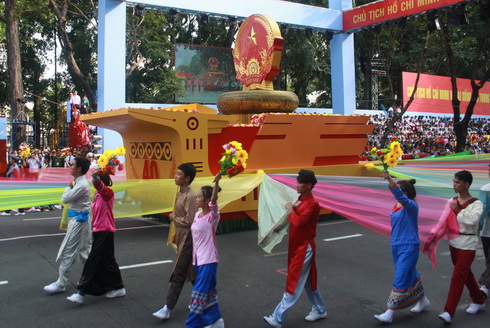 Đi đầu là đội hình Quốc huy nước Cộng hòa Xã hội Chủ nghĩa Việt Nam trên nền trống đồng, biểu hiện ý chí khát vọng của dân tộc Việt Nam. Đi cùng xe Quốc huy là 54 thanh niên trong trang phục truyền thống tượng trưng cho khối đại đoàn kết 54 dân tộc anh em. |