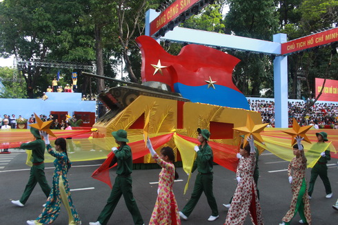 Tiếp đó, trên nền nhạc của oai hùng của bài hát "Tiến bước dưới quân kỳ" do đội quân nhạc thể hiện, các đội hình diễu binh, diễu hành lần lượt tiến vào lễ đài, thể hiện khí thế hào hùng của chiến thắng 30/4/1975 lịch sử.