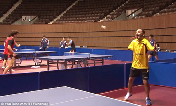| Ibrahim Hamato so vợt với cựu vô địch thế giới Wang Hao (Trung Quốc). |