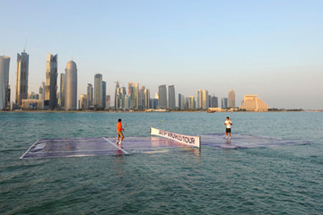 | Nadal và Federer đã có màn trình diễn ngoạn mục khi đứng trên một tấm ván ở giữa vịnh Doha chơi tennis. |
