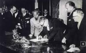 | Chủ tịch Hồ Chí Minh và Bộ trưởng Hải ngoại Pháp Marius Moutet ký bản Tạm ước Việt-Pháp ngày 14/9/1946. |