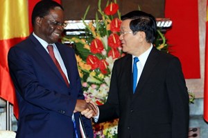 | Chủ tịch nước Trương Tấn Sang tiếp Bộ trưởng Ngoại giao và Hợp tác nước Cộng hòa Congo Basile Ikouébé. (Ảnh: TTXVN) |
