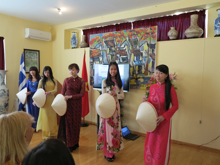 Phần giới thiệu áo dài Việt Nam diễn ra sôi động với tiết mục của các “người mẫu” là cán bộ nhân viên, phu nhân và con em của ĐSQ và sự tham gia của đại diện cộng đồng người Việt ở Hy Lạp. Chị em đã tạo được ấn tượng lớn qua điệu múa nón tự biên tự diễn, thể hiện sự duyên dáng, thủy chung của người phụ nữ Việt trong tà áo dài thiết tha, uyển chuyển và e ấp với chiếc nón bài thơ xứ Việt. Tiết mục “ẩm thực truyền thống Việt” luôn là một phần được các bạn bè chờ đón. Sự hướng dẫn khéo léo và phần trình diễn khá thuần thục của các đầu bếp người Việt về các món nem rán, nem cuốn, chả, xôi... trong mùi thơm đặc biệt tỏa từ các nguyên liệu truyền thống tự nhiên của Việt Nam gây được những tiếng trầm trồ, thán phục từ các bà, các cô và các phóng viên.