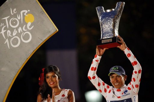 | Tay đua trẻ Nairo Quintana về nhì đồng thời đoạt áo chấm đỏ. |