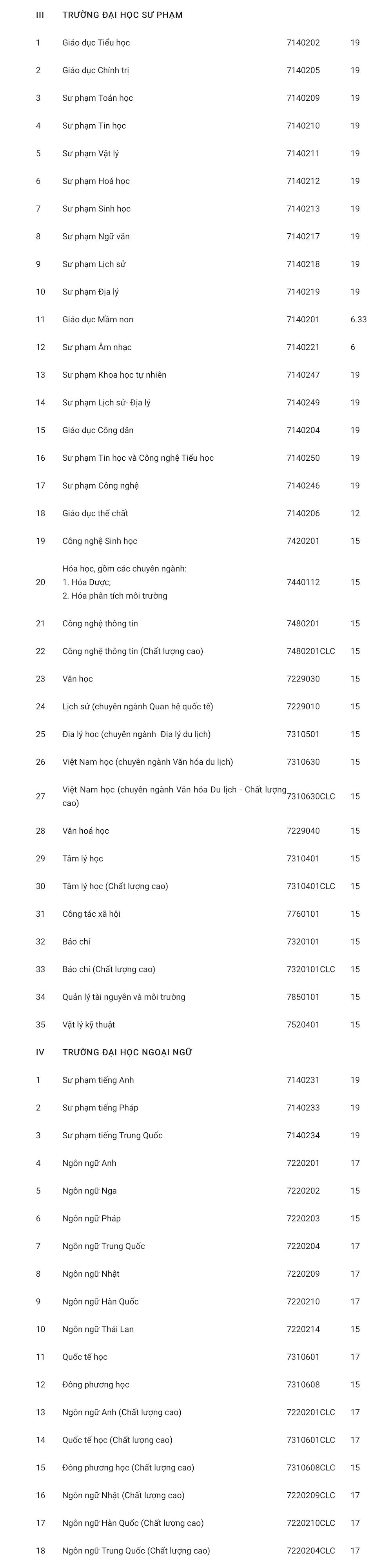 Điểm sàn vào các ngành thuộc nhóm ngành đào tạo giáo viên (trừ các ngành Giáo dục Mầm non, Sư phạm Âm nhạc, Giáo dục Thể chất) và các ngành thuộc Khoa Y Dược là tổng điểm 3 môn của tổ hợp xét tuyển không nhân hệ số, cộng với điểm ưu tiên khu vực, đối tượng.