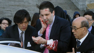 | Đại sứ Mỹ tại Hàn Quốc Mark Lippert với vết thương đầy máu trên mặt được dìu ra xe để đến bệnh viện (Nguồn: AP). |