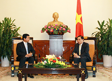 | Thứ trưởng Ngoại giao Lê Hoài Trung tiếp Đại sứ Somphone Sichaleune. Ảnh: Anh Sơn/TGVN |