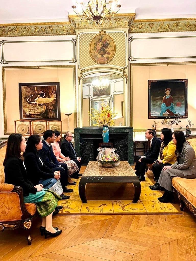 | Đoàn Đại sứ quán Lào tại Bỉ do Đại sứ và Phu nhân dẫn đầu đến chúc mừng Tết cổ truyền Việt Nam. |
