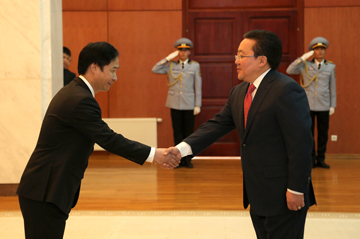 | Ðại sứ Việt Nam tại Mông Cổ Phan Ðăng Ðương trình Thư ủy nhiệm của Chủ tịch nước Trương Tấn Sang lên Tổng thống Mông Cổ Tsakhiagiin Elbegdorj. |