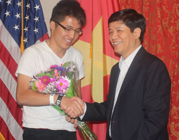 | Đại sứ Việt Nam tại Mỹ Nguyễn Quốc Cường trao quà cho học sinh đạt giải |