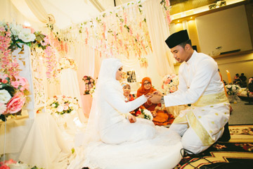 Để bắt đầu các nghi lễ đám cưới, một nhóm gồm bốn người tế lễ bước vào hội trường, thắp lên bốn ngọn nến. Sau đó, cô dâu tiến vào lễ đường trong ánh mắt hồi hộp của chú rể và mọi người. Theo sau cô là bảy bà mối, mang khay bạc để hoa, khay đựng một bộ gồm mười sáu ấm nước bằng bạc, khay đựng quạt thêu dát vàng và khay vàng đựng trầu. Kế tiếp là 16 phù dâu, mang 16 cây nến và một nhóm phù dâu khác, mang bốn hộp bạc đựng trầu. Hai nhân vật chính và tất cả những người có mặt cùng cầu nguyện. Bố của chú rể Aziz Hafiz cầm tay anh đặt lên tay cô dâu Aqilah Idrus, công nhận hai anh chị là vợ chồng trong lời chúc phúc của mọi người.