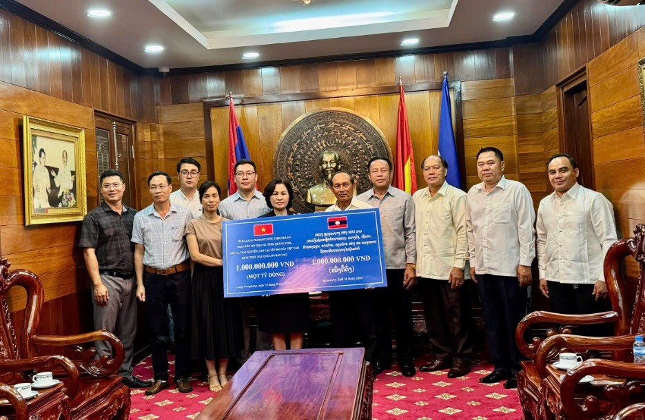 | Đồng chí Khamkhan Chanthavisouk thay mặt Đảng bộ, Chính quyền tỉnh Luang Prabang thăm hỏi, trao số tiền 1.000.000.000 VND ủng hộ giúp đỡ các tỉnh Việt Nam khắc phục hậu quả sau bão Yagi. |