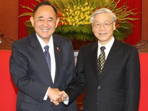 | Tổng Bí thư, Chủ tịch Quốc hội Nguyễn Phú Trọng tiếp Đoàn đại biểu cấp cao ICAPP do ngài Jose De Venecie dẫn đầu. (Ảnh: TTXVN) |