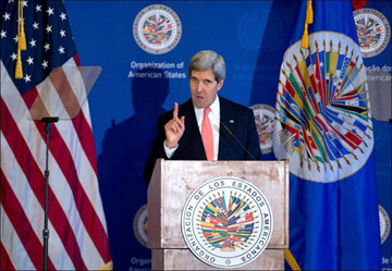 | Ngoại trưởng Mỹ John Kerry phát biểu tại trụ sở OAS về chính sách mới của Washington với khu vực Mỹ Latinh. |