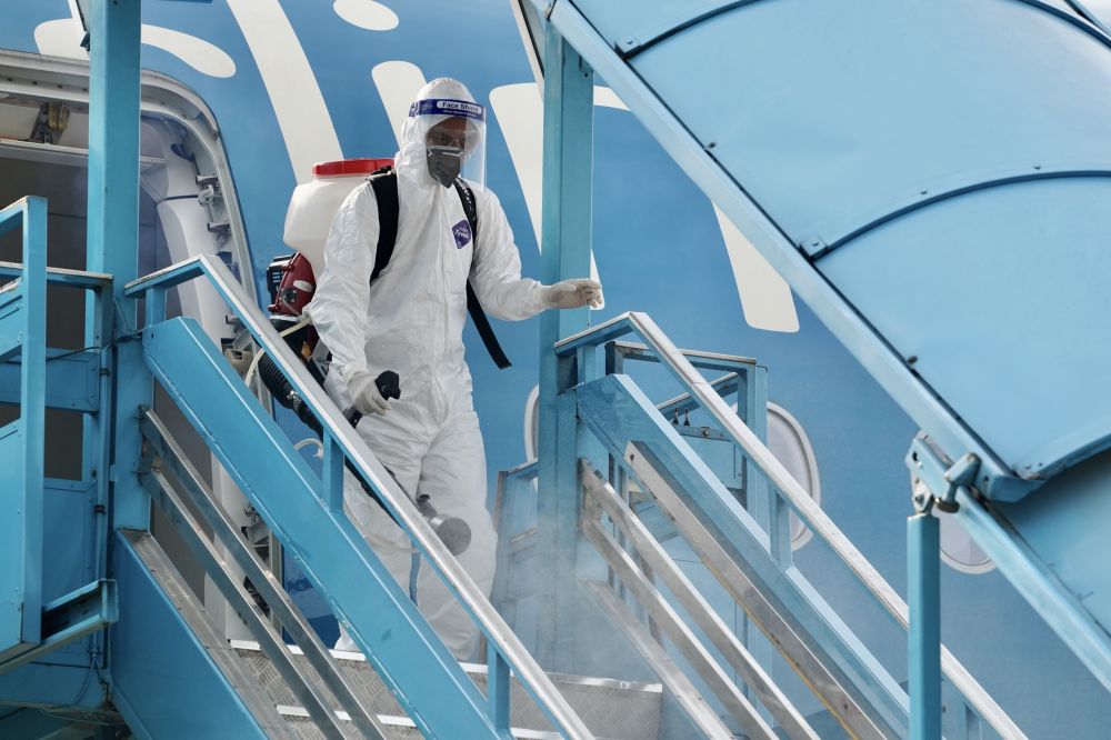 | Nhân viên phun thuốc khử trùng lỗi lên xuống máy bay trước khi đón công dân. |