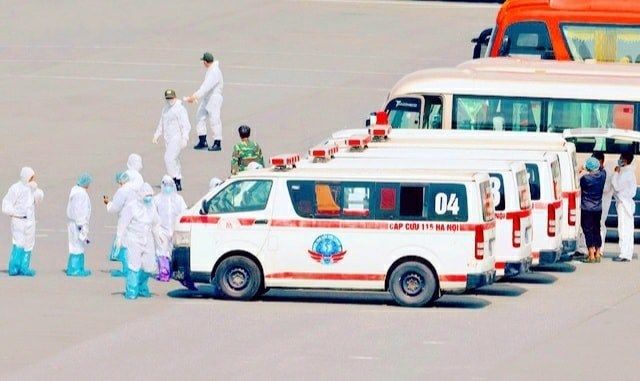 | Tại sân bay Nội Bài, những chiếc xe chở công dân và bệnh nhân về khu cách ly và chữa trị đã sẵn sàng. |
