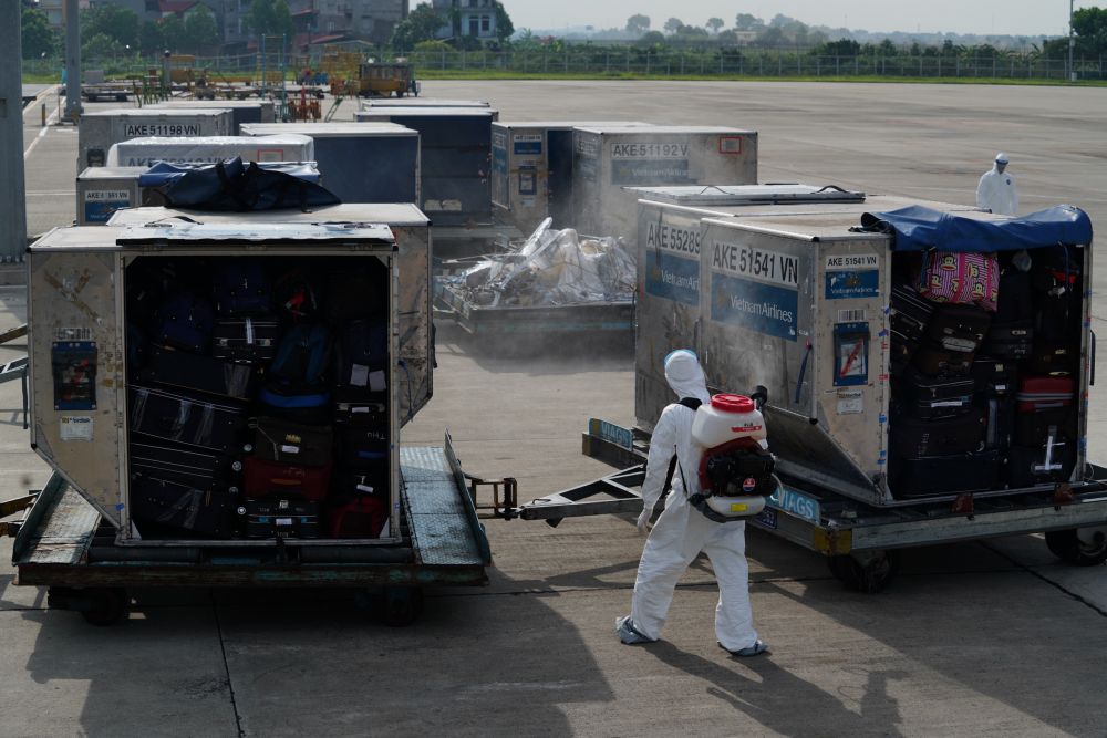 | Hành lý được vận chuyển xuống. Tất cả hành lý của các lao động sẽ được tập trung tại khu vực riêng để khử trùng. |