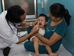 | Bác sỹ Bệnh viện Nhiệt đới thăm, khám bệnh cho trẻ bị tay chân miêng. (Ảnh: Phương Vy/TTXVN) |