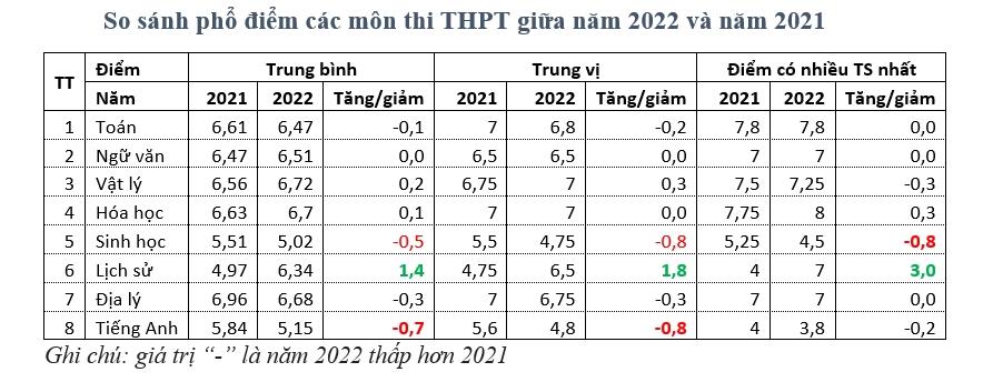 Ở góc độ khác, điểm trung bình môn tiếng Anh giảm nhiều nhất (giảm 0,7 điểm), kế đến là môn Sinh học (giảm 0,5 điểm). Điểm trung vị của hai môn Sinh học và tiếng Anh đều giảm tới 0,8 điểm với với năm 2021.