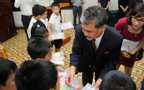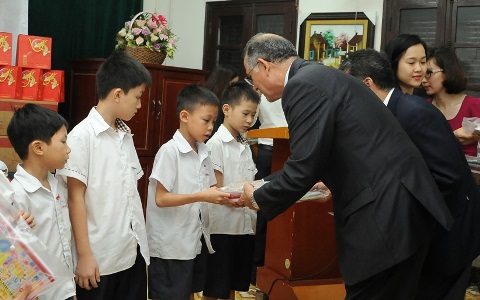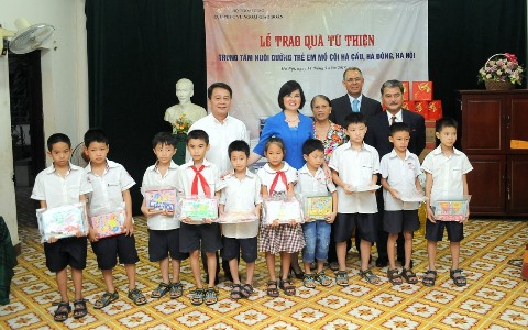 | Các Đại sứ trao quà cho các cháu tại Trung tâm. |