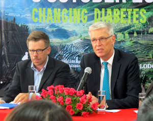 | Đại sứ Đan Mạch John Nielsen (bên phải) giới thiệu về Cuộc chạy marathon vượt núi đầu tiên tại Việt Nam do Đại sứ quán tổ chức. (Ảnh: QĐND) |