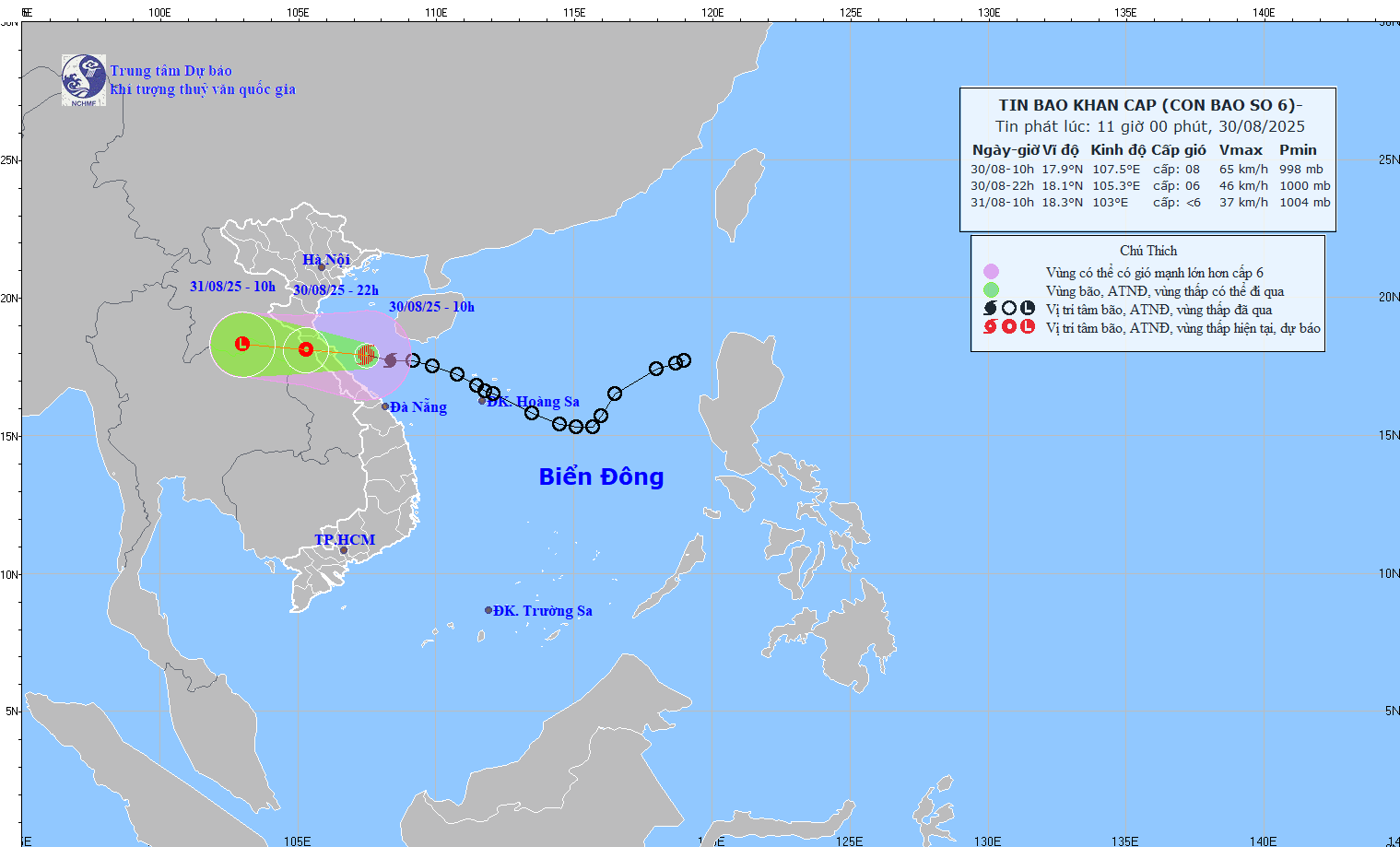 Trung tâm Dự báo khí tượng thủy văn quốc gia thông tin, ngày và đêm 31/8, khu vực vịnh Bắc Bộ, vùng biển từ Lâm Đồng đến Cà Mau, Cà Mau đến An Giang, vịnh Thái Lan, khu vực Bắc, giữa và Nam Biển Đông (bao gồm các đặc khu Hoàng Sa và Trường Sa) có mưa rào và giông rải rác, trong mưa giông có khả năng xảy ra lốc xoáy, gió giật mạnh cấp 6-7 và sóng biển cao 1-2m.