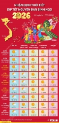 | Thời tiết dịp nghỉ Tết Nguyên đán Bính Ngọ: Khu vực Bắc Bộ có mưa vài nơi, trưa chiều trời nắng, đêm và sáng trời rét Theo Trung tâm Dự báo khí tượng thủy văn Quốc gia, dịp nghỉ Tết Nguyên đán Bính Ngọ 2026 (từ ngày 17-22 tức ngày mùng ... |
