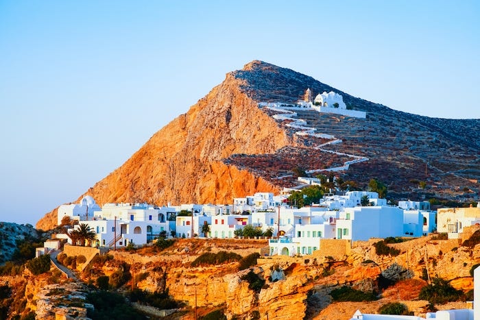 | Màu xanh mênh mông của biển Aegean cùng màu trắng nổi bật của ngôi nhà Cycladic trên đảo Folegandros chắc chắn sẽ nằm trong List-to-go của những tín đồ thích xê dịch. Bầu không khí thư giãn ngự trị trên khắp hòn đảo, những bãi biển bình dị, những thị trấn nhỏ xen kẽ những con hẻm, cùng thưởng thức món Matsata - một loại mì ống tự làm tại địa phương, mạo hiểm leo lên đỉnh đá nhà thờ Panagia hùng vĩ, khám phá một số cảnh quan tuyệt vời của thị trấn... chắc chắn sẽ là những trải nghiệm đáng nhớ của khách tham quan khi đặt chân lên hòn đảo này. (Nguồn: Getty Images) |