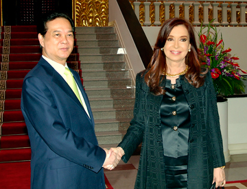 Nhiệt liệt chào mừng Tổng thống Cristina Femández de Kirchner sang thăm chính thức Việt Nam, Thủ tướng Nguyễn Tấn Dũng đánh giá cao kết quả hội đàm giữa Chủ tịch nước Trương Tấn Sang với Tổng thống Cristina Femández de Kirchner, cho rằng chuyến thăm sẽ là dấu mốc đưa quan hệ hợp tác Việt Nam và Argentina lên tầm cao mới.