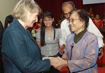 Tại cuộc gặp gỡ thân tình này, bà Nguyễn Thị Bình - Nguyên Phó Chủ tịch nước, Chủ tịch Quỹ Hòa bình và Phát triển Việt Nam bày tỏ sự cảm ơn chân tình đến những hoạt động nổi bật của bạn bè quốc tế đã giúp đỡ Việt Nam như Dự án xây dựng Làng hữu nghị Vân Canh; hệ thống 11 làng hòa bình do tổ chức hòa bình quốc tế xây dựng; Hội luật gia dân chủ quốc tế tổ chức Tòa án lương tâm tại Paris vào tháng 5/2009... Bà khẳng định nhân dân Việt Nam luôn tri ân những đại diện xuất sắc của phong trào hòa bình, đoàn kết và hữu nghị với Việt Nam trong cuộc đấu tranh ủng hộ nhân dân Việt Nam giành độc lập trước đây và cuộc đấu tranh vì hòa bình, công lý và phát triển Việt Nam hiện nay.