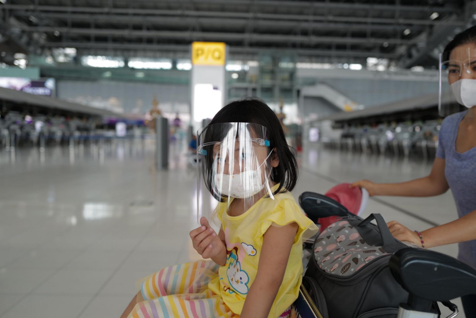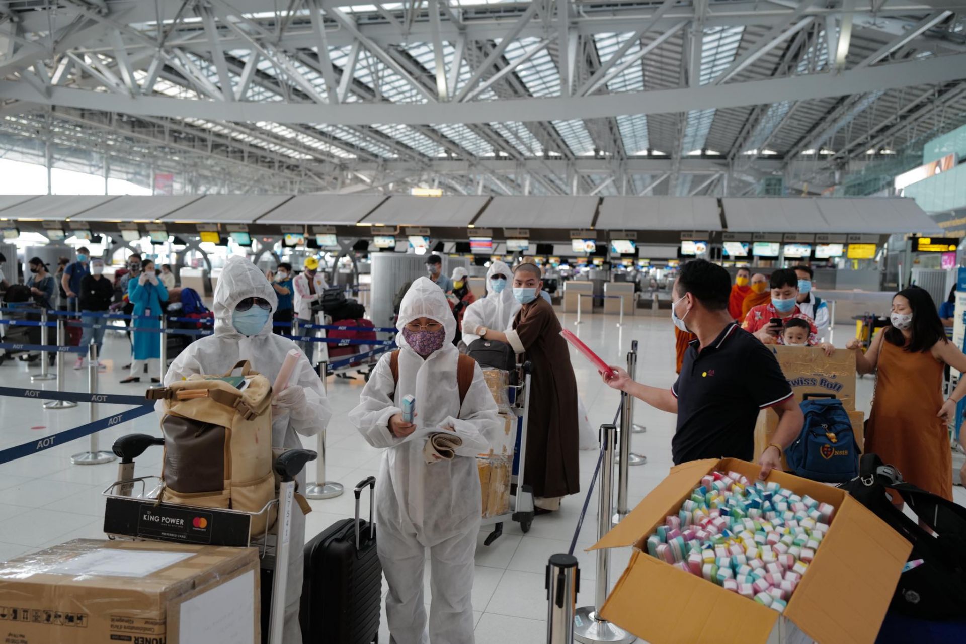 | Cán bộ Đại sứ quán Việt Nam tại Thái Lan phát tặng tấm kính chắn bảo hộ cho bà con tại sân bay. (Ảnh: T.T) |